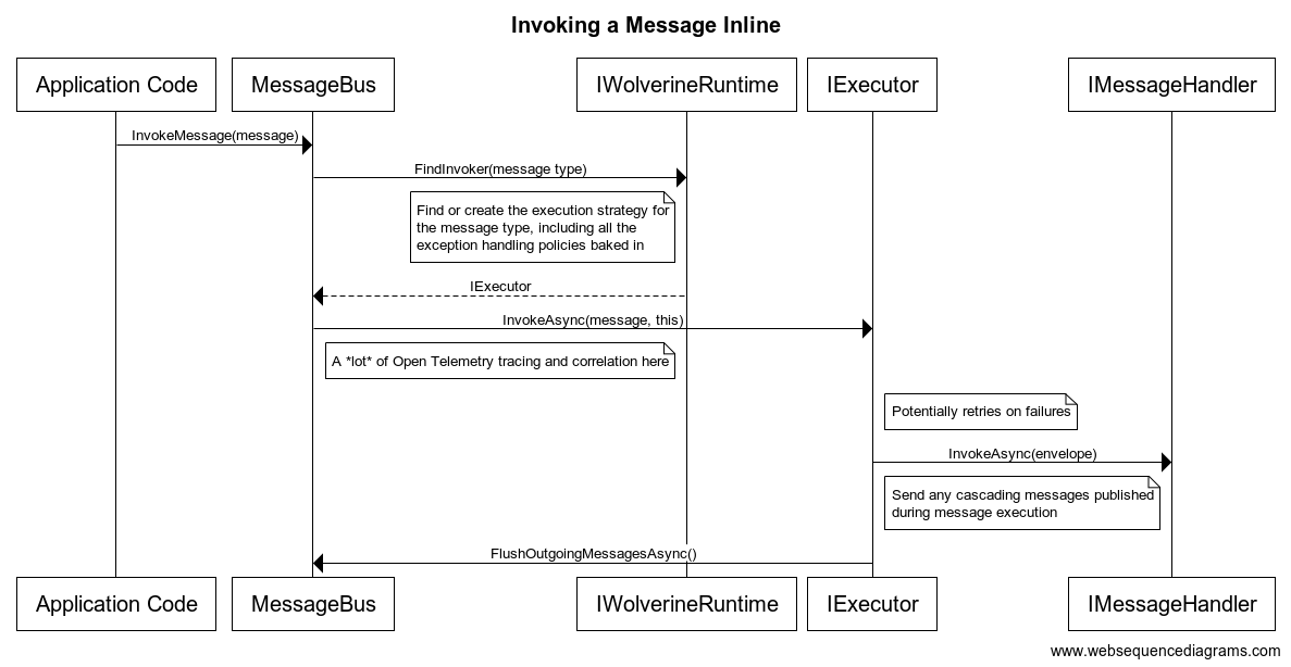 At runtime, you can use Wolverine to invoke the message handling for a message inline in the current executing thread with Wolverine effectively acting as a mediator:
