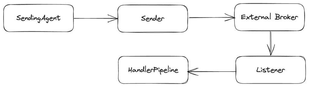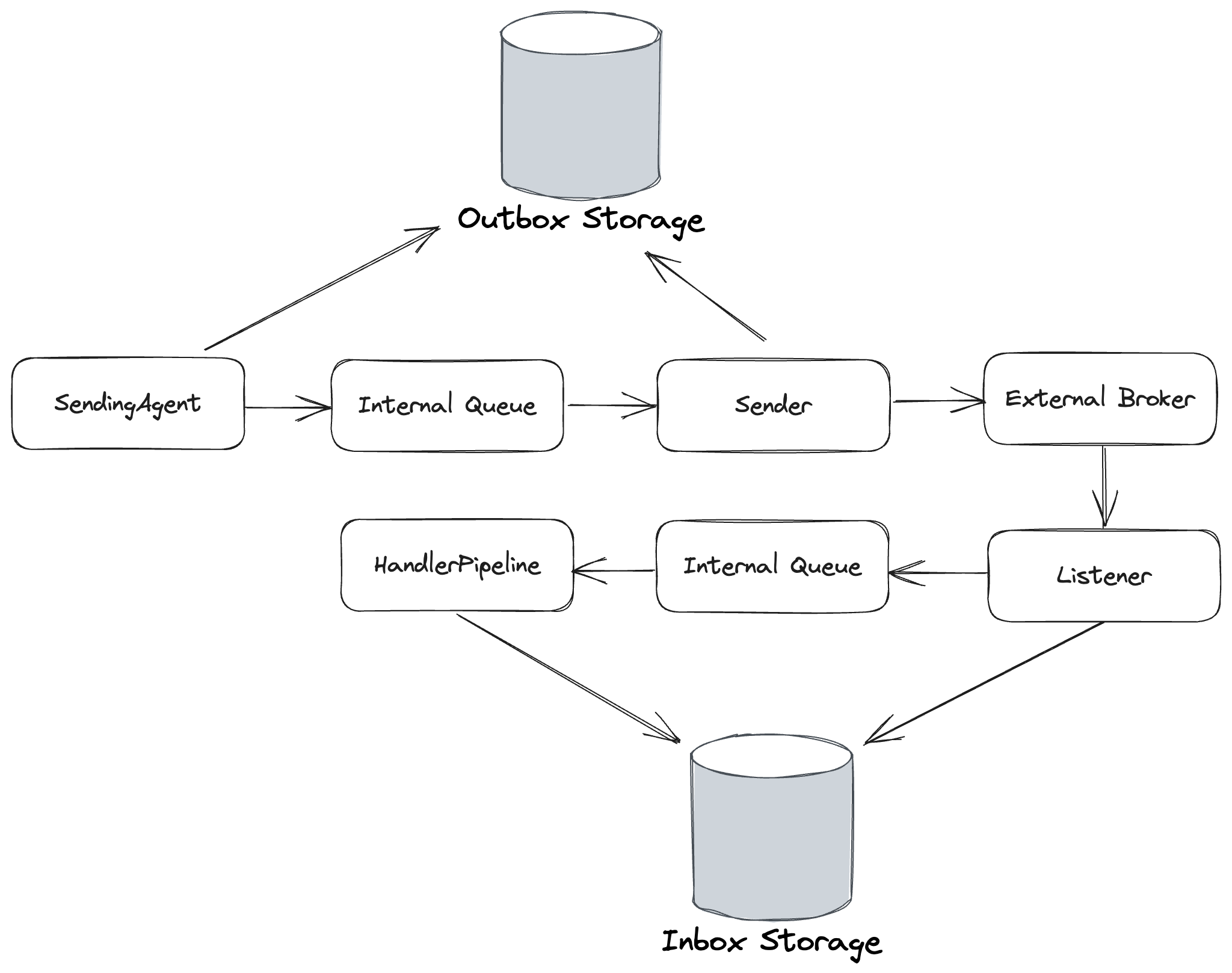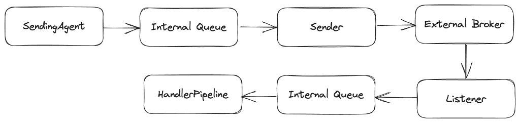 In the second Buffered option, messages are queued locally between the actual external broker and the Wolverine handlers or senders.