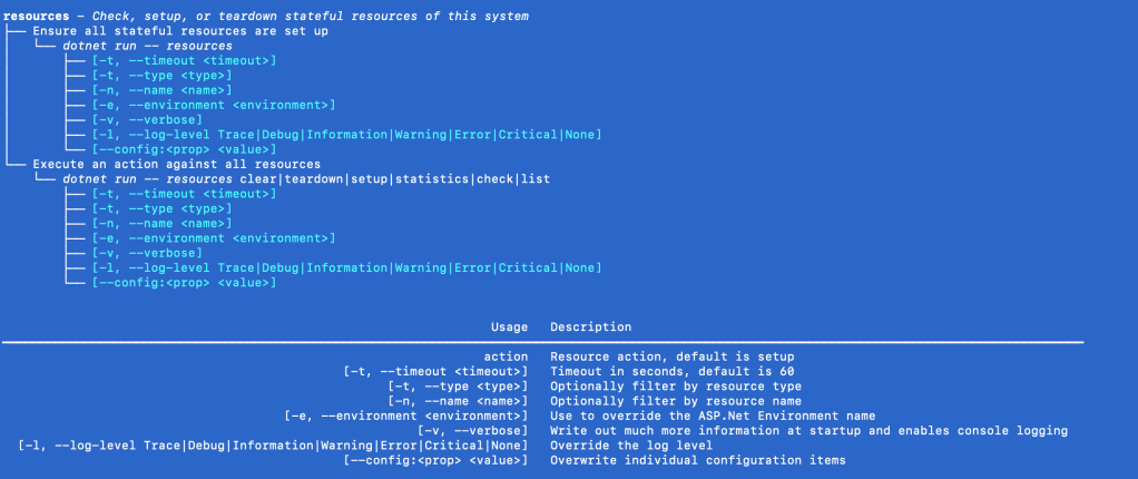 To help unwind potential problems with diagnostic tools and to facilitate environment setup, the “Critter Stack” uses the Oakton library to integrate command line utilities right into your application.