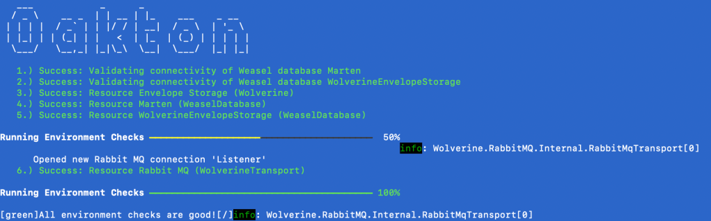 To that end, Oakton has its environment check model that both Marten and Wolverine utilize. In our help desk application, we already have a Marten dependency, so we know the application will not function correctly if either the database is unavailable or the connection string in the configuration just happens to be wrong or there’s a security set up issue or you get the picture.