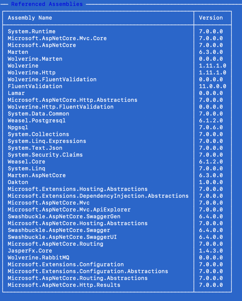 Admittedly, Wolverine and to a lesser extent Marten have a bit of a “magic” conventional approach. They also depend on external configuration items, external infrastructural tools like databases or message brokers that require their own configuration, and there’s always the possibility of assembly mismatches from users doing who knows what with their Nuget dependency tree.
