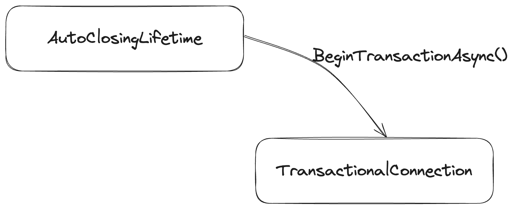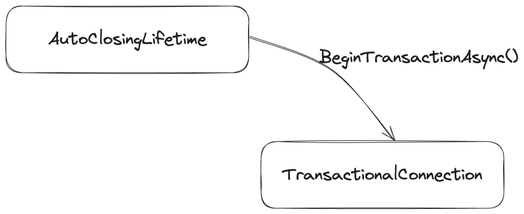 By default now, each IDocumentSession is created with a reference to our default flavor of IConnectionLifetime called AutoClosingLifetime. But when you call BeginTransactionAsync(), the session is creating an all new object with all new behavior for the newly started connection and transaction like this: